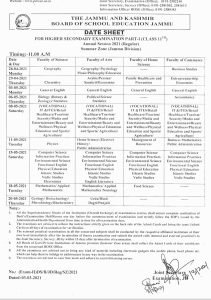 Datesheet for Higher Secondary Examination Part-I(Class 11th ) Annual, Session 2021 (Regular), SZ , Jammu Division.