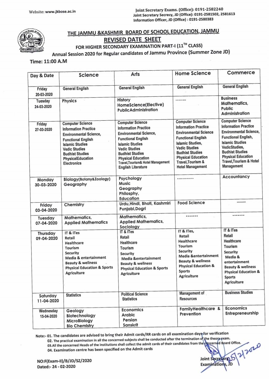 Revised Datesheet for HSP-I (class 11th) Annual Session 2020 for Regular candidates of Jammu Province (Summer Zone JD)